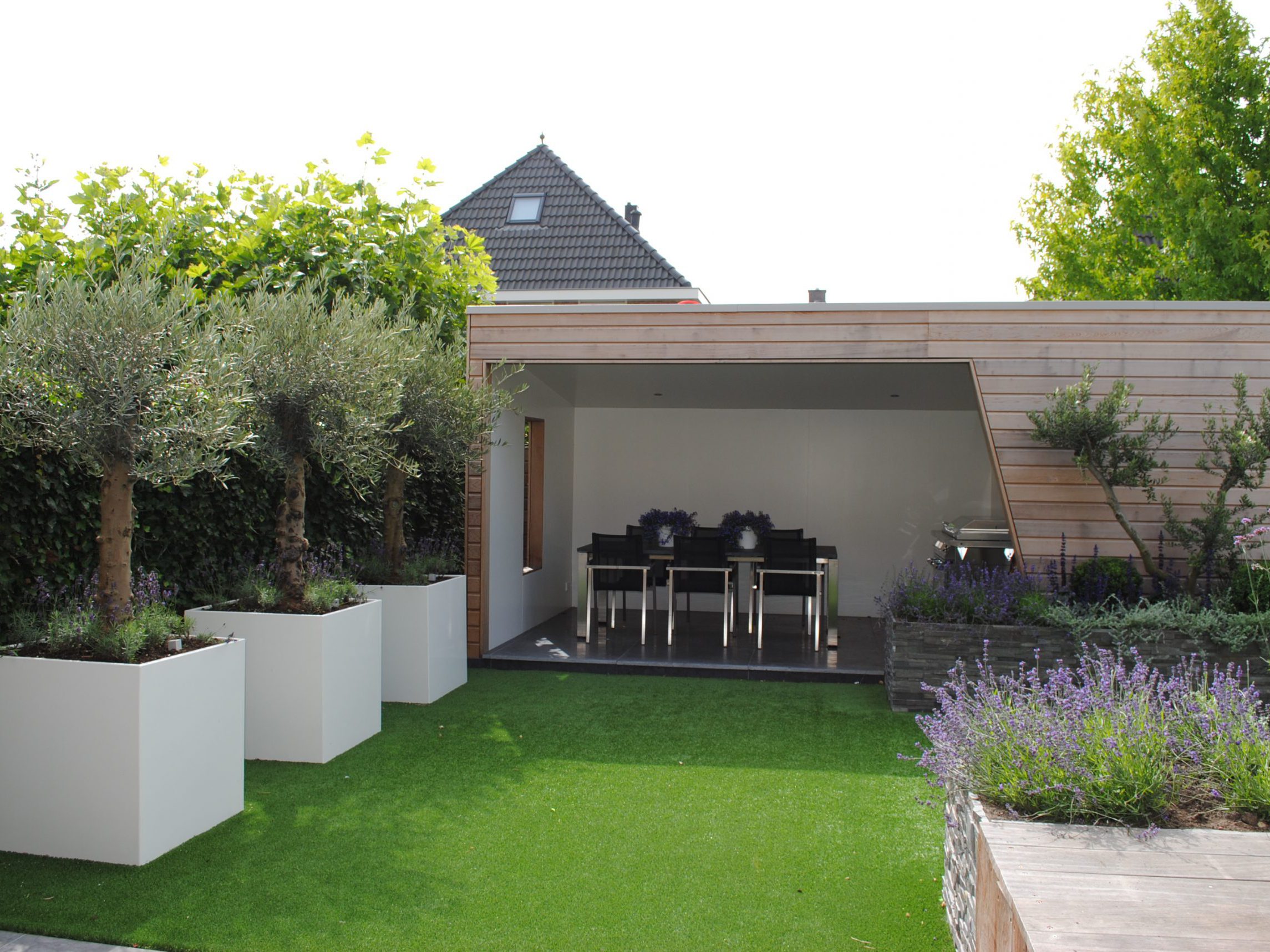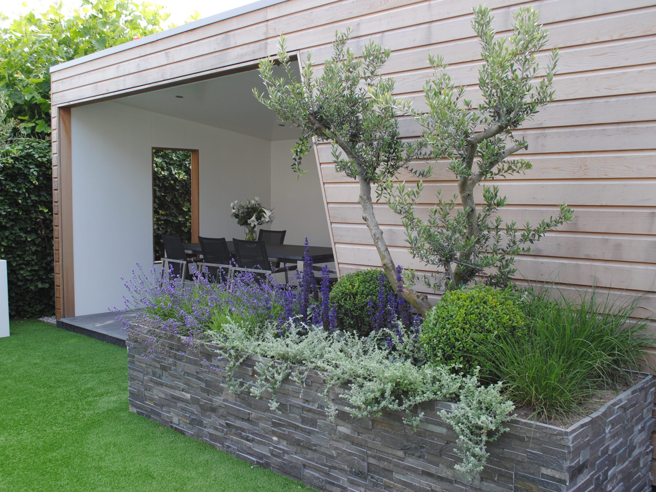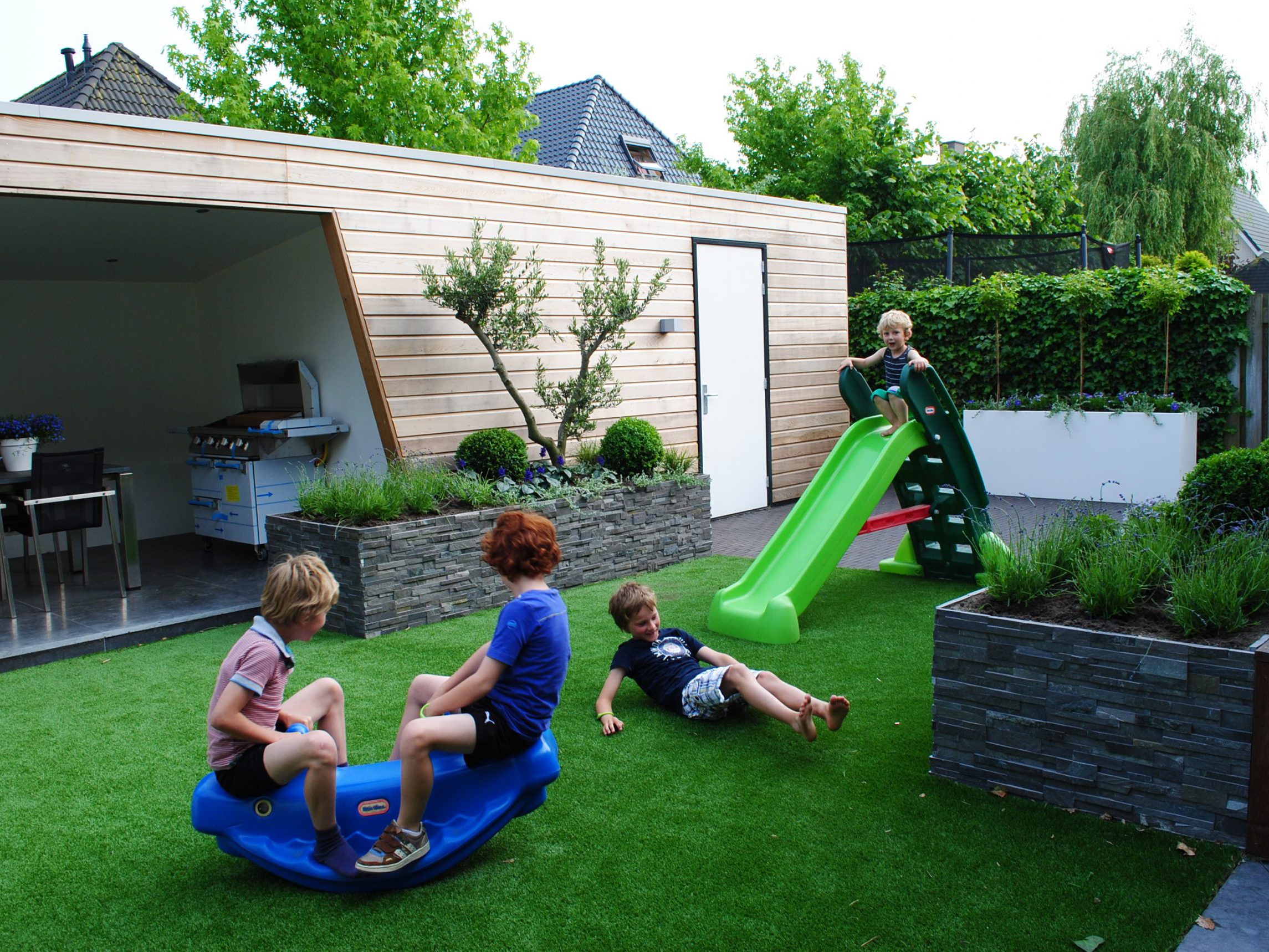 Het gebouw is een combinatie van berging speelgoed en tuingereedschap en een lounge met BBQ.