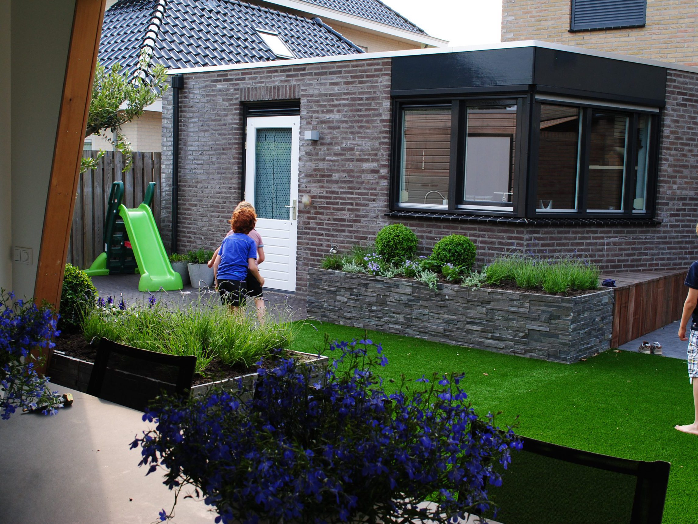 Kunstgras is zacht aan de voeten en onder kunstgras komt 20cm zand. Hierdoor heb je altijd een goede afwatering en geen gras wat tegen de bak op groeit.