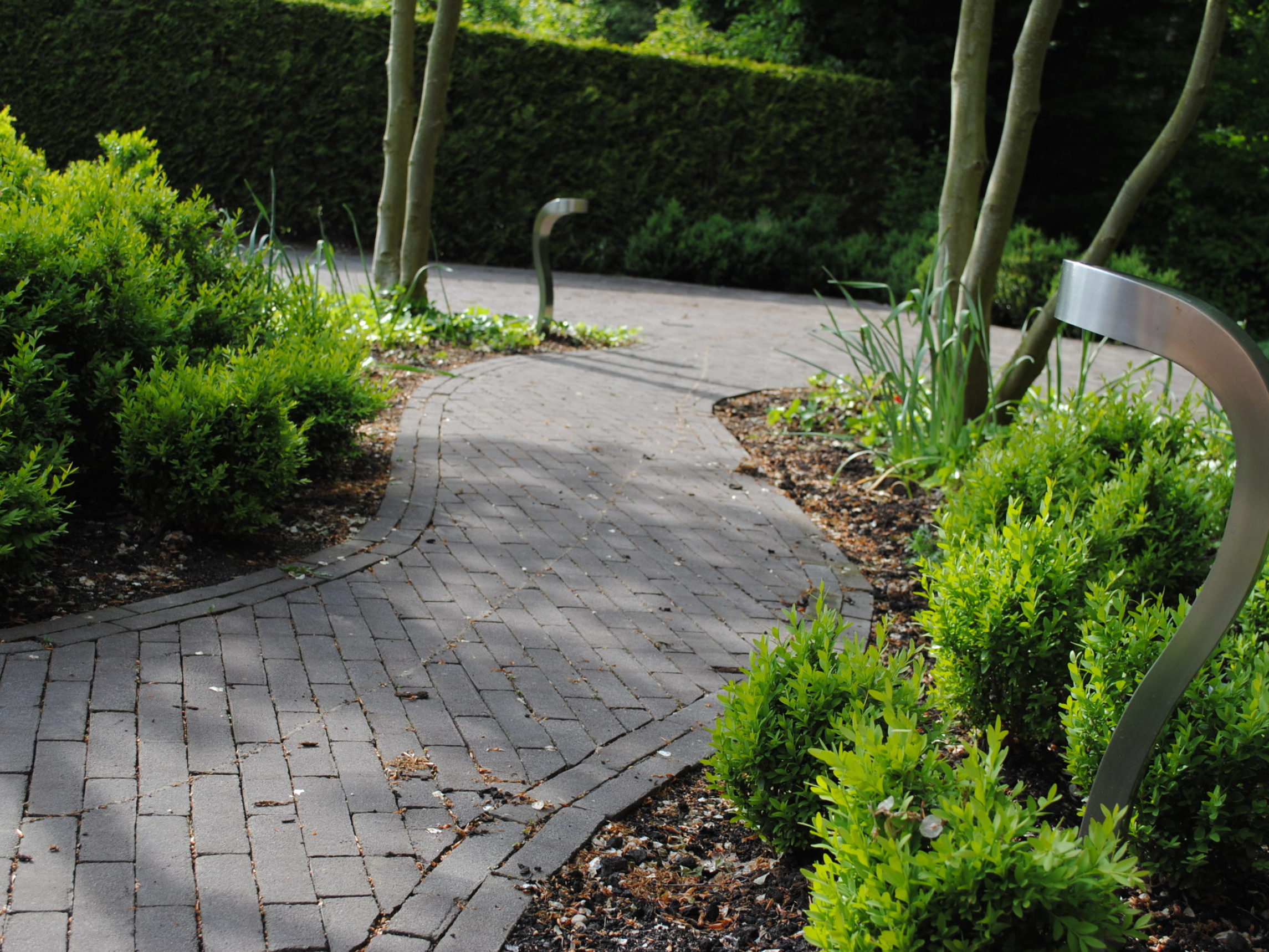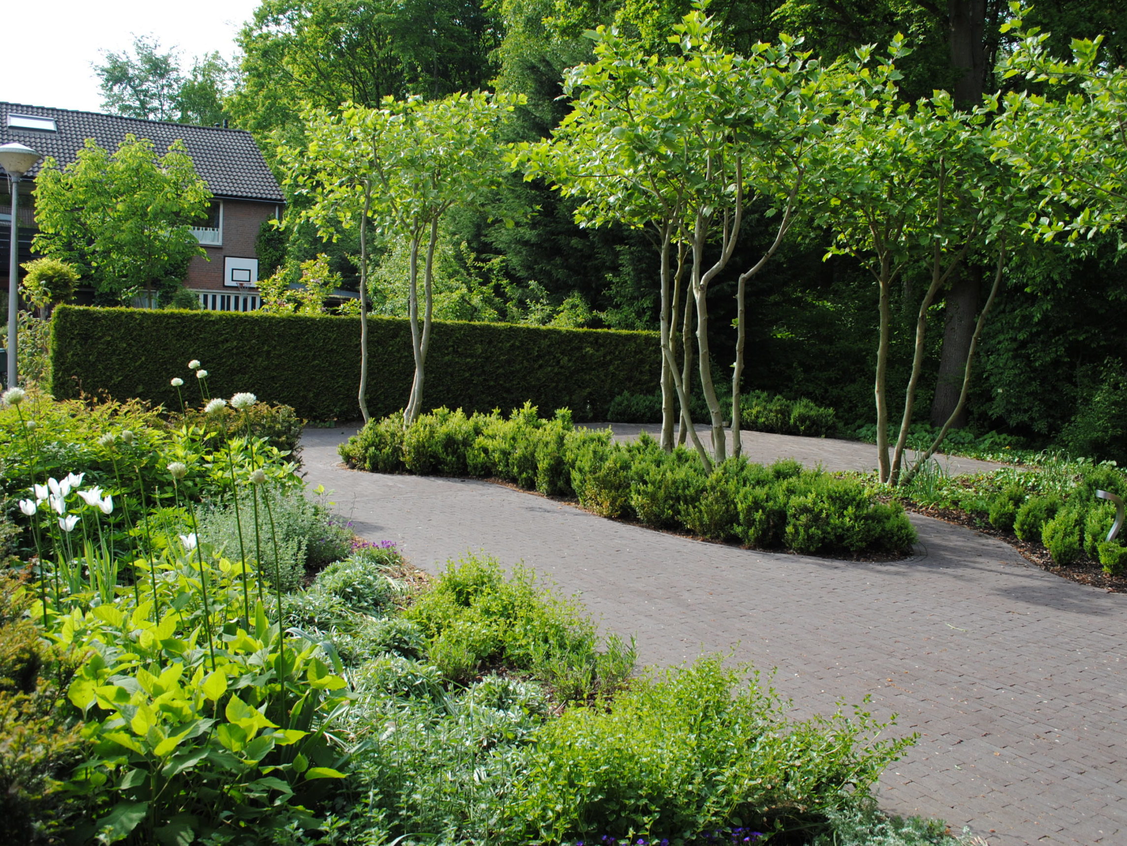 De tuin heeft voldoende ruimte om te parkeren met de eenvoud van deze meerstammige bomen heeft deze voortuin een bijzondere uitstraling.