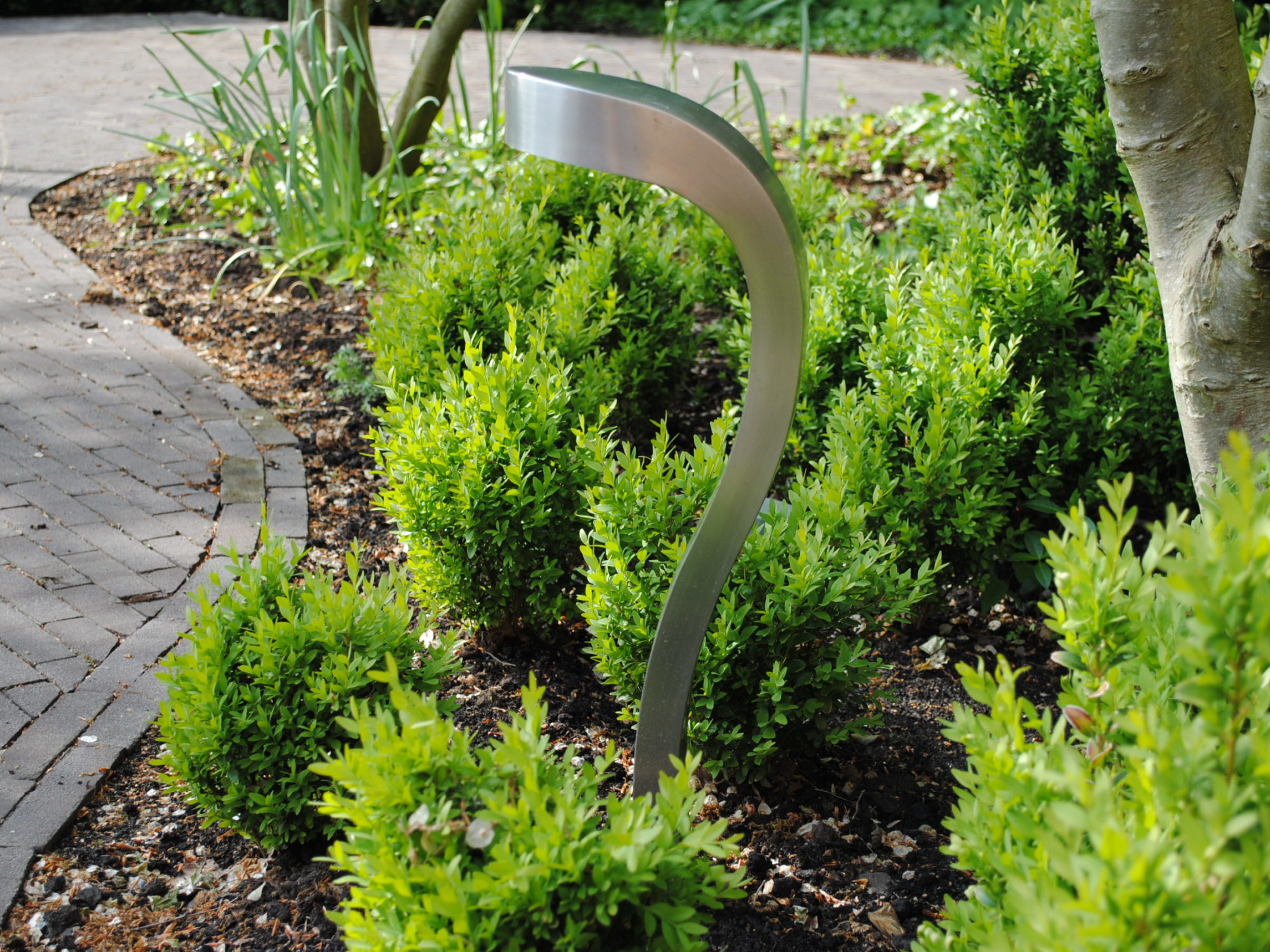 Deze voortuin ligt tegen een bos aan en de bewoner houdt erg van bomen.