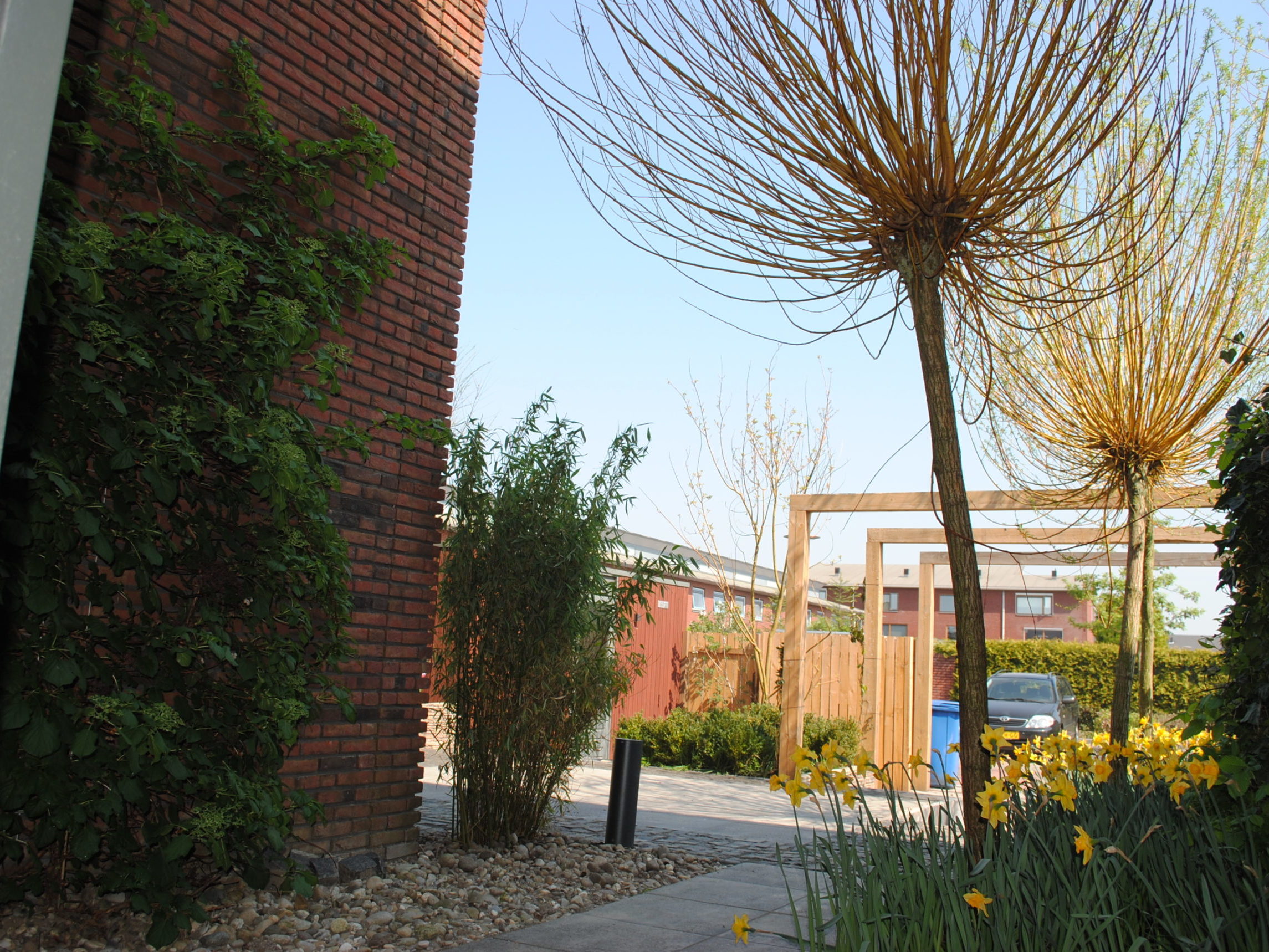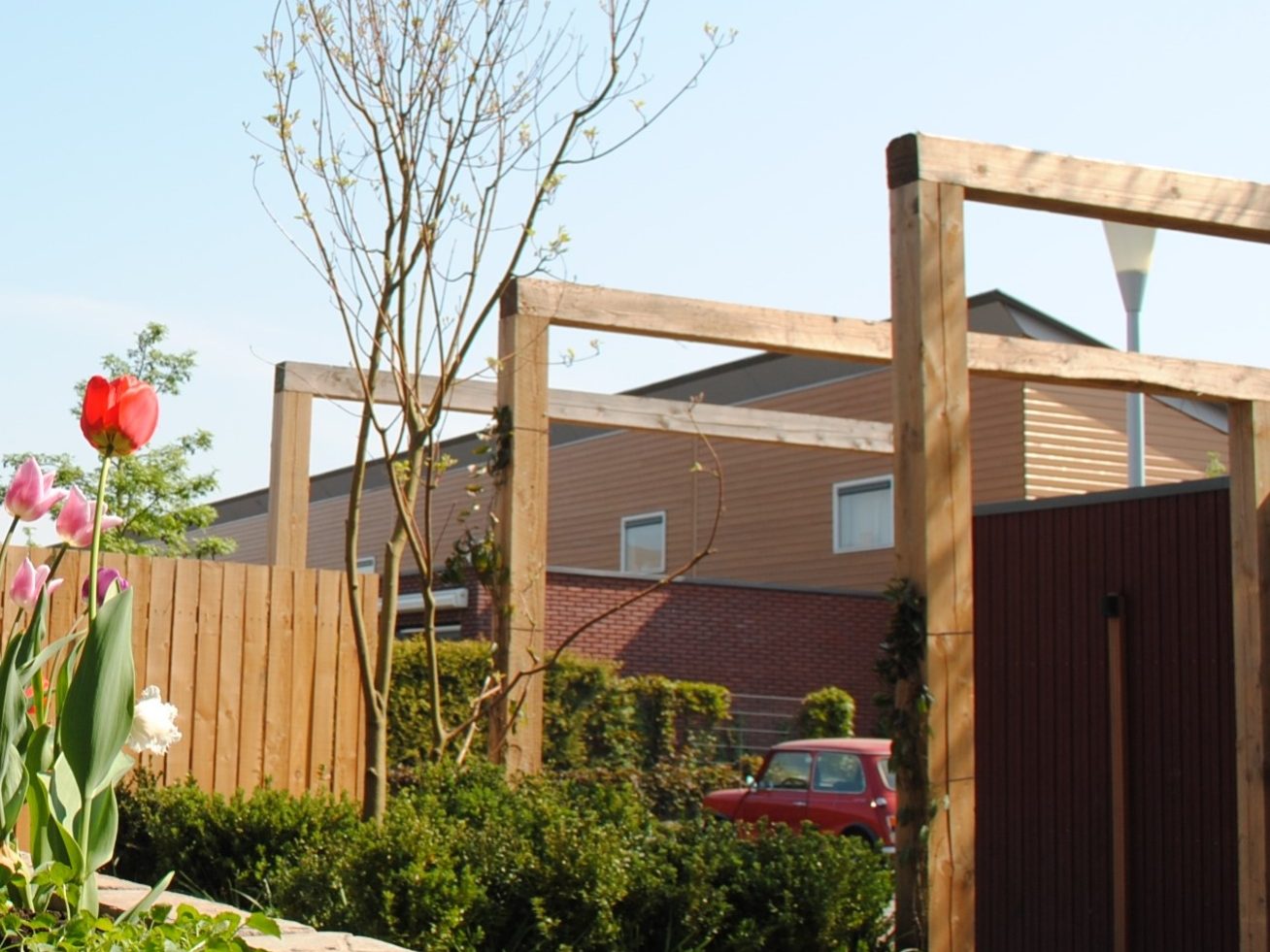 Een robuuste pergola als achtergrond en boven het parkeergedeelte.