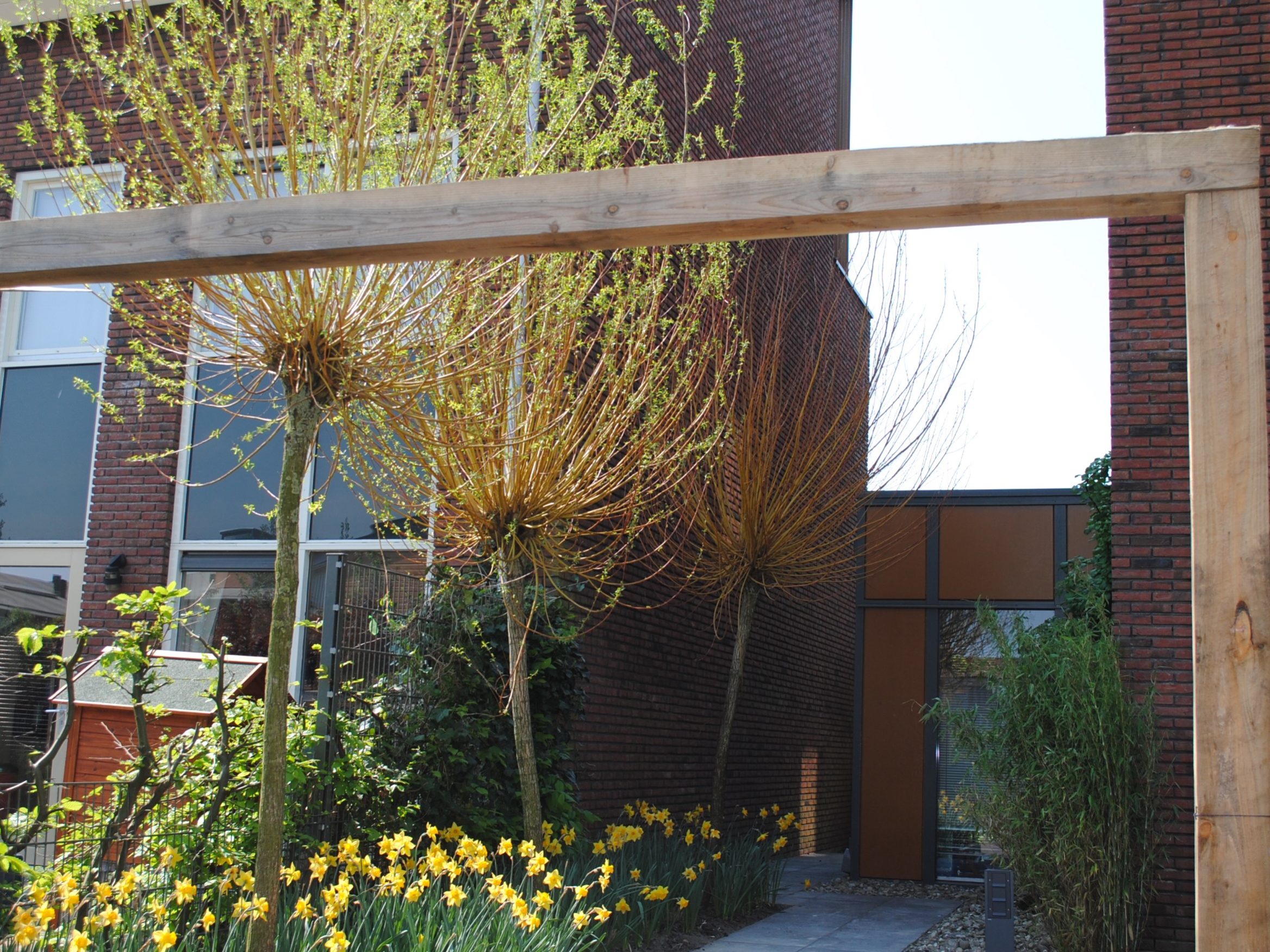 Links is een plantvak met knotwilgen, bij aanvang volwassen bomen.
